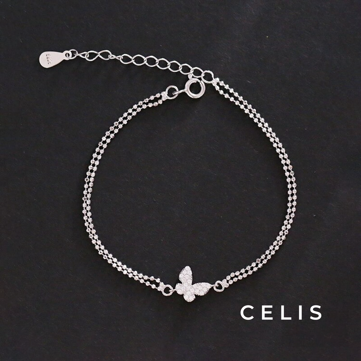 A simple bracelet with an elegant and cute design using zirconia attached to a butterfly charm. Pair it with a slender ring◎
