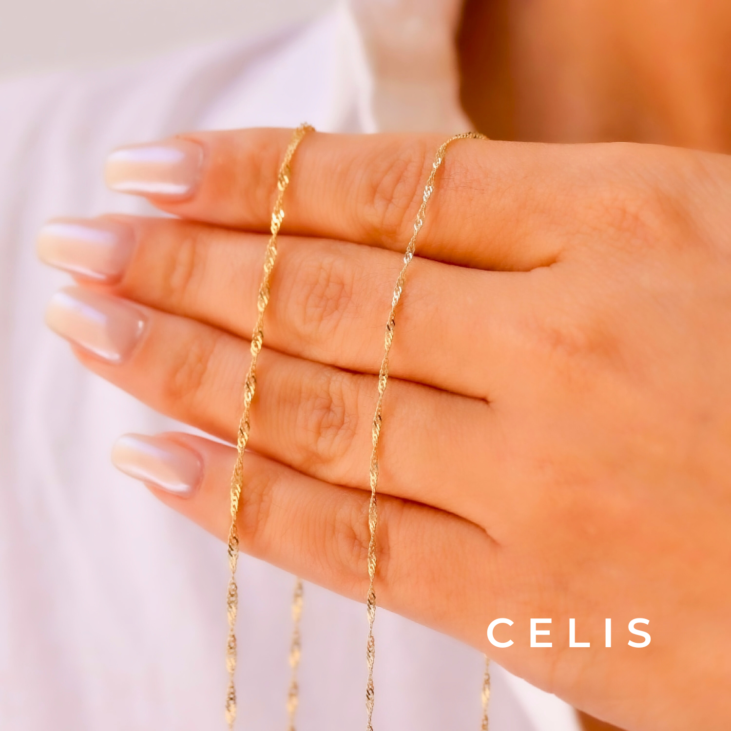 Slender twisted gold chain necklace.